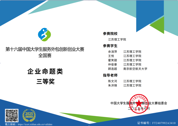 近日,第十六届中国大学生服务外包创新创业大赛总决赛圆满落幕。我院朱洪锦、陈文河等教师指导的两支参赛队伍表现亮眼,最终斩获全国一等奖1项、三等奖1项。其中,姜琦、吴恩颢、钱志鹏、程明宇、陆佩岑组成的团队凭借扎实的专业能力与创新的解决方案,荣获全国总决赛企业命题类一等奖;余涓萍、王悦、霍笑甜、仲俊豪、顾连超组成的团队获全国总决赛企业命题类三等奖。